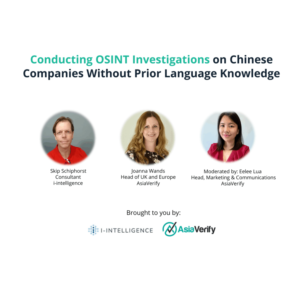 We will be joined by Skip Schiphorst from i-intelligence and Joanna Wands from AsiaVerify to explore various OSINT sources that are accessible and relevant for researching Chinese companies. In particular, how to apply the techniques and Open Source Data in KYC/KYB Investigations.